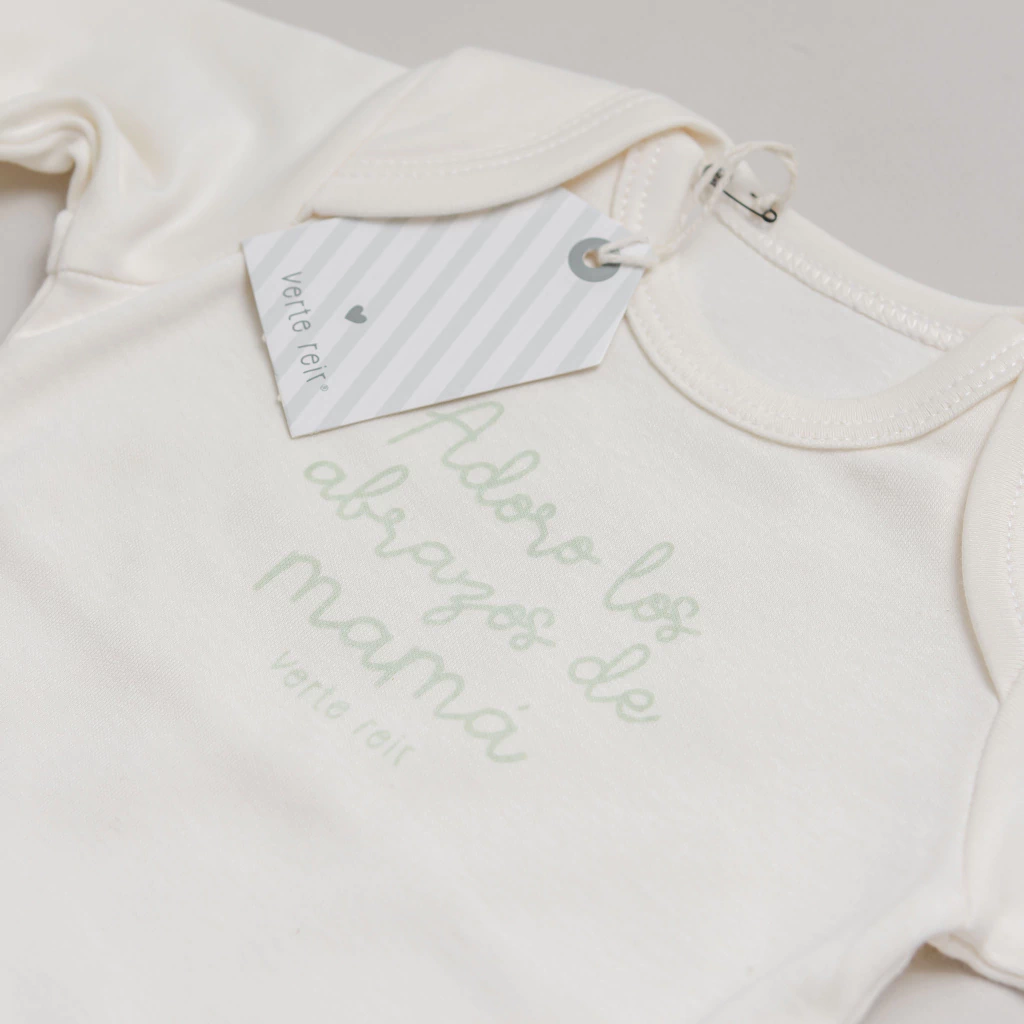 El Mini Ajuar incluye un Body ML de cuello americano, confeccionado en 100% algodón peinado, con una estampa al agua a 3 tonos que le da un toque único y original.