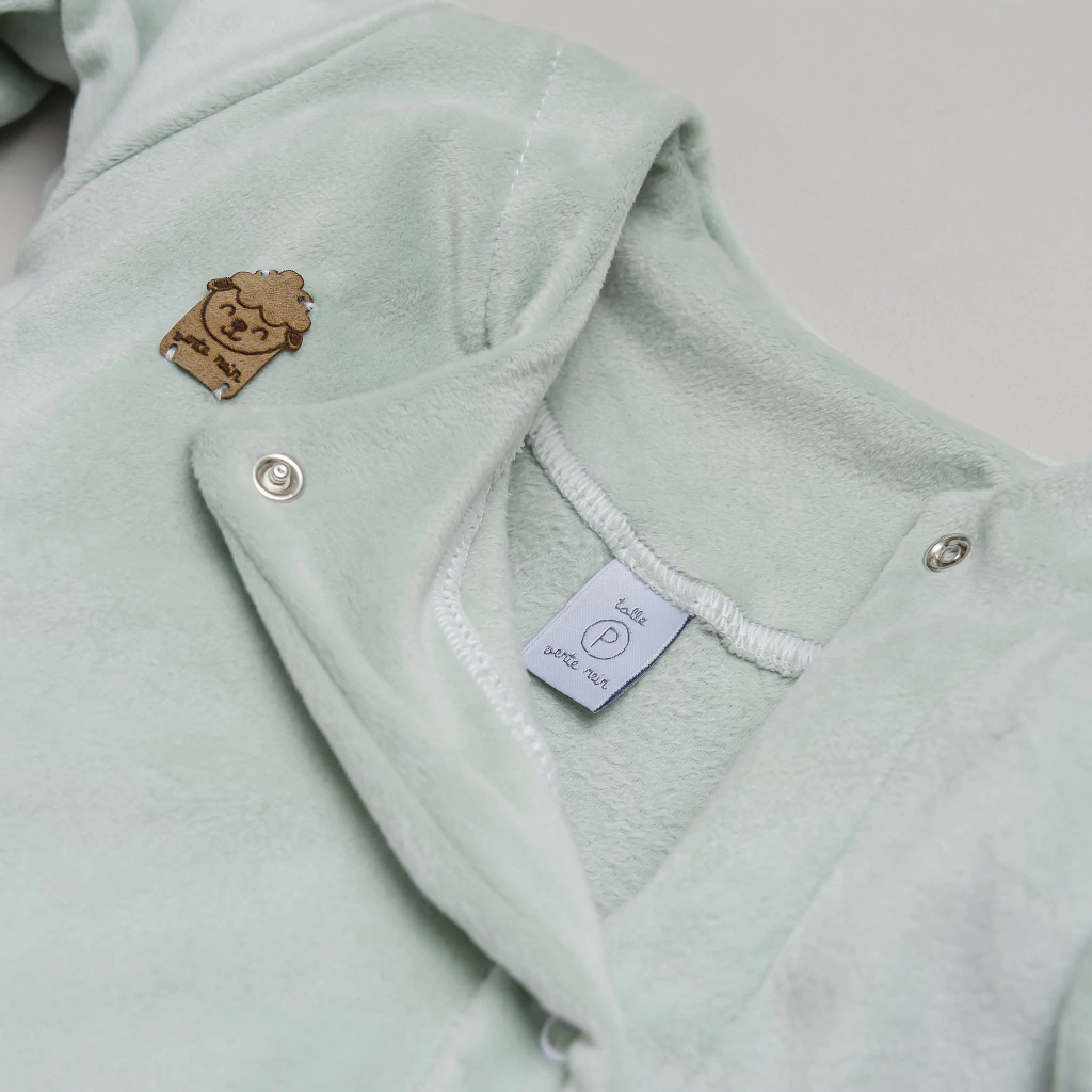 Lo diseñamos con una apertura total frontal, lo que facilita el cambio de ropa sin necesidad de manipular la cabecita de tu bebé. Sin piecitos, para que dure un poquito más y siempre teniendo en cuenta que debajo podemos acompañar con una ranita que cubra el piecito, y ganchitos al tono, para que se vea aún más lindo.