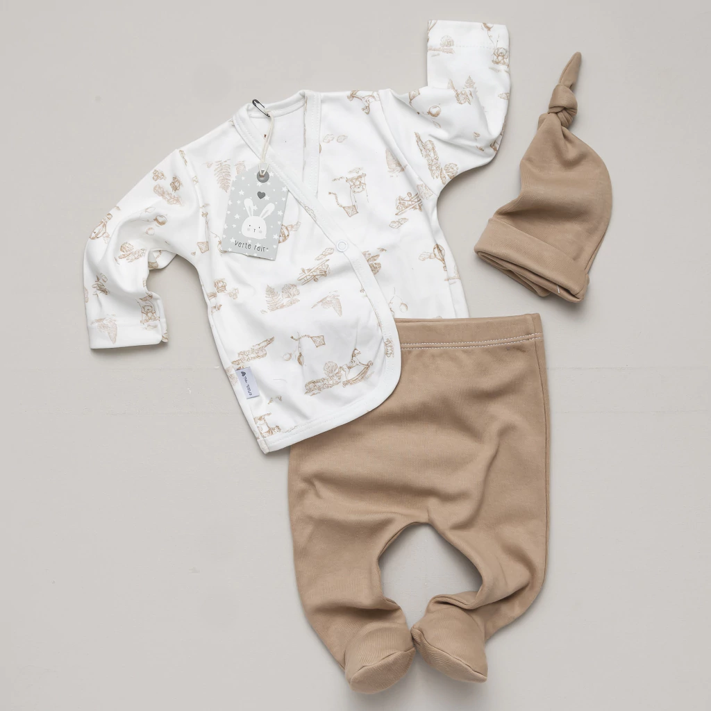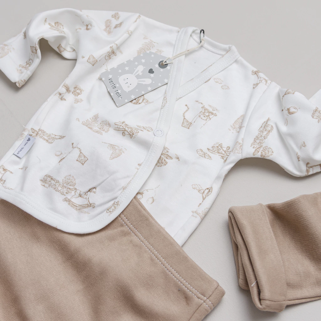 Éste ajuarcito incluye una batita ML cruzada, confeccionada en 100% algodón peinado estampado, para asegurar suavidad y comodidad.