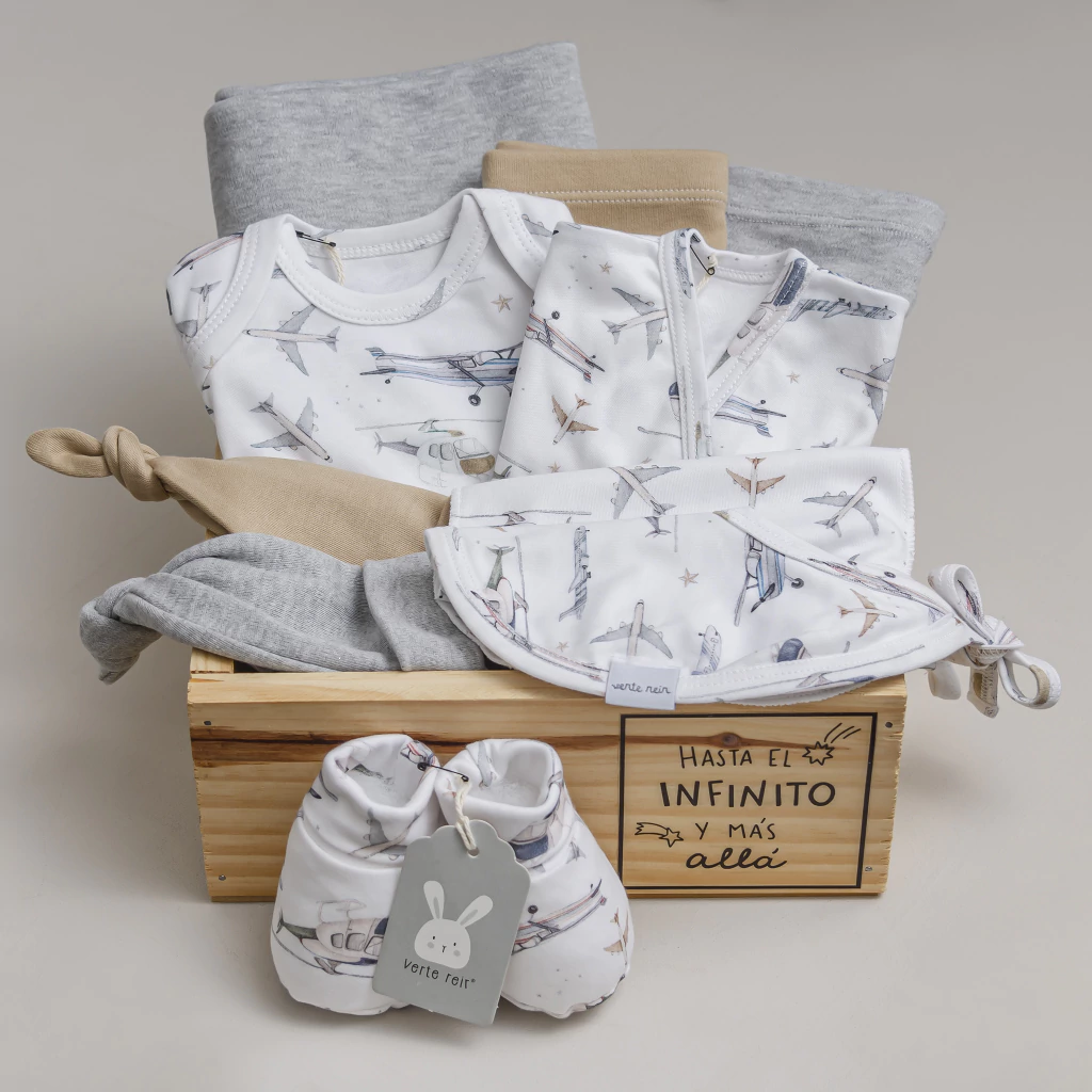 Este Pack de Bienvenida de 10 piezas es la elección ideal para recibir a tu bebé en camino con todo lo necesario para sus primeros días. Presentado en una súper cajita de madera, éste pack combina estilo y funcionalidad, asegurando que tu bebé esté cómodo y divino.