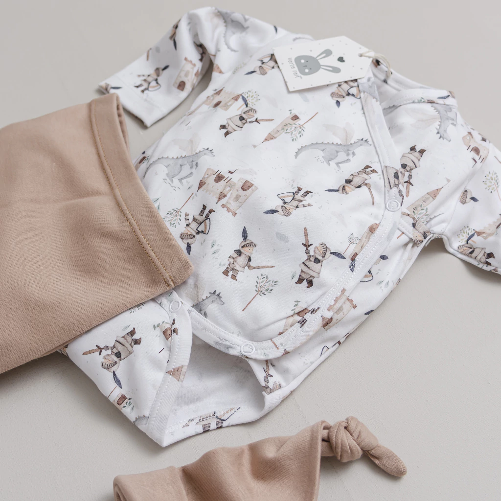 Completa el ajuar una ranita con pie y un gorrito con nudo, ambos en un delicado color NOUGAT. Todas las prendas están confeccionadas en algodón peinado, asegurando la máxima suavidad y comodidad para la piel de tu bebé.